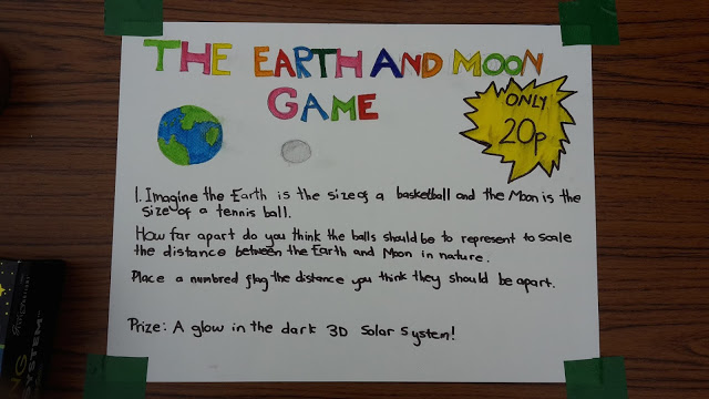 We saw a few interesting tactics though. One girl put one flag so it was the closest to the Earth compared to all the other flags, then another so it was the furthest out. She seemed to think that everyone else had either over- or underestimated the distance - which of course they had! (She didn't win though, as someone put their flag even further out later on.) Someone else put five flags over a range of about 25cm where she thought the Moon would be.