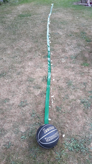 The basketball representing the Earth is in the bottom of the picture, and the tennis ball just visible at the top is the Moon, 7.2 metres away. To the right of the green tape are white flags that are the players' guesses for where the Moon would be.