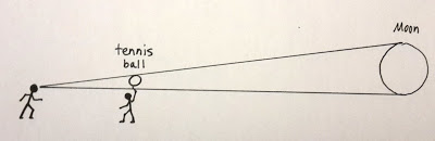The most successful approach seemed to be for the player to stand where the Earth is, and have someone walk away holding the tennis ball until it subtends the same angle as the Moon does in the sky (or your mind's eye). This is easier said than done, however. The player in fourth place (who was about five years old) used this technique.