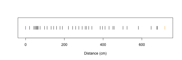 It's striking that all the guesses were too low. This seems to be a mixture of two things. Firstly, people really do think that the Moon is closer than it actually is. Secondly, people tend to copy other people, so they would place their flags close to where the others were. (We told everyone that the Moon didn't have to be restricted to the green tape - that just happened to be how long it was.)